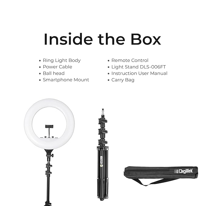 • 𝗗𝗶𝗴𝗶𝘁𝗲𝗸 (𝗗𝗥𝗟-𝟭𝟴𝗥𝗧 𝗖 𝟲): 18 Inch LED Ring Light, complete with a 158cm Flexible/Adjustable Light Stand and Remote Control for effortless illumination control.